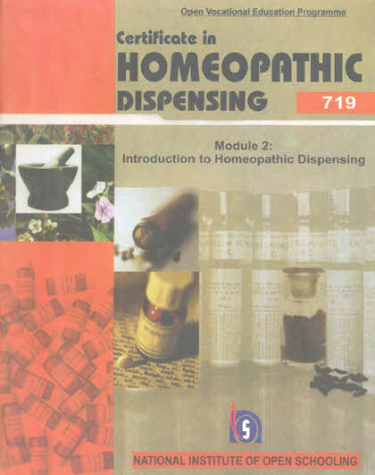 NIOS 719 - Certificate in Homeopathic Dispensing [AI 01]Chapter 1: Pharmacy and Homeopathic PharmacyChapter 2: Sources, Collection and Preservation of Drug SubstancesChapter 3: Homeopathic DispensaryChapter 4: Preparation of Homeopathic MedicineChapter 5: Homeopathic PosologyChapter 6: List Of Essential Drugs With AbbreviationsChapter 7: Study of Prescription and Abbreviations Used in PrescriptionChapter 8: Drugs and Cosmetic Act, Medicinal and Toilet Preparation ActChapter 9: Duties and Responsibilities of a Dispenser