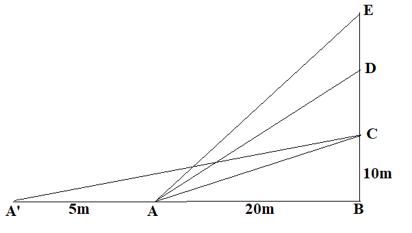 The Government of India is planning to fix a hoarding board at the face of a building on the road of a busy market for awareness on COVID-19 protocol. Ram, Robert and Rahim are the three engineers who are working on this project. “A” is considered to be a person viewing the hoarding board 20 metres away from the building, standing at the edge of a pathway nearby. Ram, Robert and Rahim suggested to the firm to place the hoarding board at three different locations namely C, D and E. “C” is at the height of 10 metres from the ground level. For the viewer A, the angle of elevation of “D” is double the angle of elevation of “C” The angle of elevation of “E” is triple the angle of elevation of “C” for the same viewer. Look at the figure given and based on the above information answer the following: