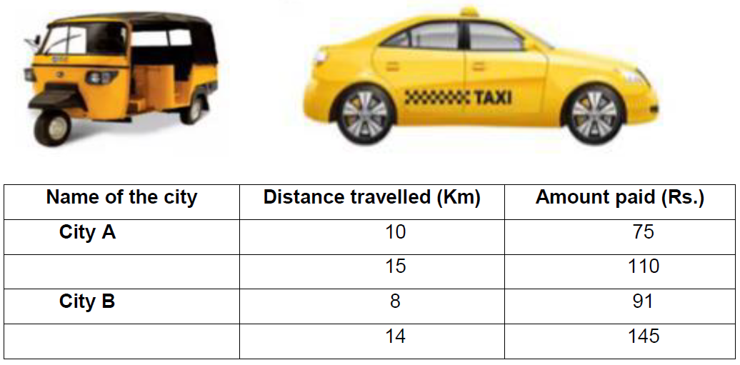Situation 1: In city A, for a journey of 10 km, the charge paid is Rs 75 and for a journey of 15 km, the charge paid is Rs 110.